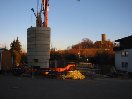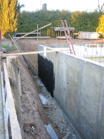 ![]() Westseite = Straßenseite Der Bitumenanstrich ist teilweise fertig Das Loch in der Bildmitte ist für Strom und Telefon; ein Loch weiter hinten wird für das Zuwasser sein. |