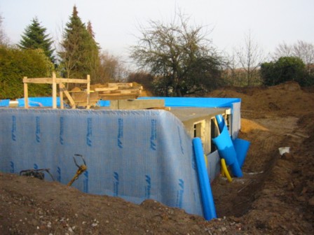 ![]() Der Keller im "Verhüterli" rundum mit 12cm Isolierungsschicht gut gedämmt, und dann mit der blauen Folie umgeben. Die Baugrue ist bereits größtenteils aufgeschüttet. |