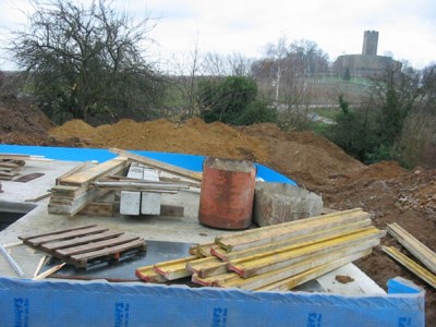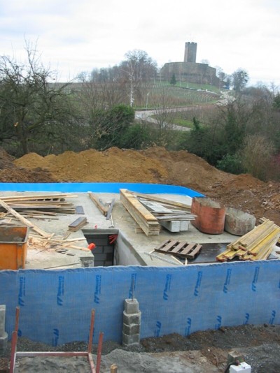 ![]() Zisterne Unterteil. SIe kommt nun doch nach links. Die arme Zypressse steht nur noch auf einem Inselchen, aber sie hält sich tapfer! Im Hintergrund die Punktfundamente für die Veranda. |