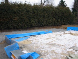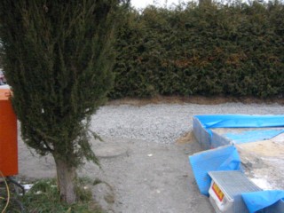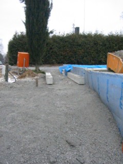 ![]() Die Grube zur Straßenseite ist nun auch ganz aufgefüllt Oben sieht man die beiden Fundamentbalken für die Veranda. Der hier rechte sitzt auf den Fundamentsäulen, der linke auf Erdreich. Ganz toll finde ich, daß der Bereich bis zur Straße aufgeschottert wurde - dann schleppen die Monteure, Handwerker und wir nicht so viel Muttererde ins Häuschen..... |
