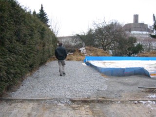 ![]() Der Bauherr schreitet den zukünftigen PKW-Stellplatz ab. Der Bereich ist grob geschottert. Später muß nur noch Kies o.ä. drauf, dann dürfen dort die Töffs wohnen. Hier kommt dann später auch der Carport her. |